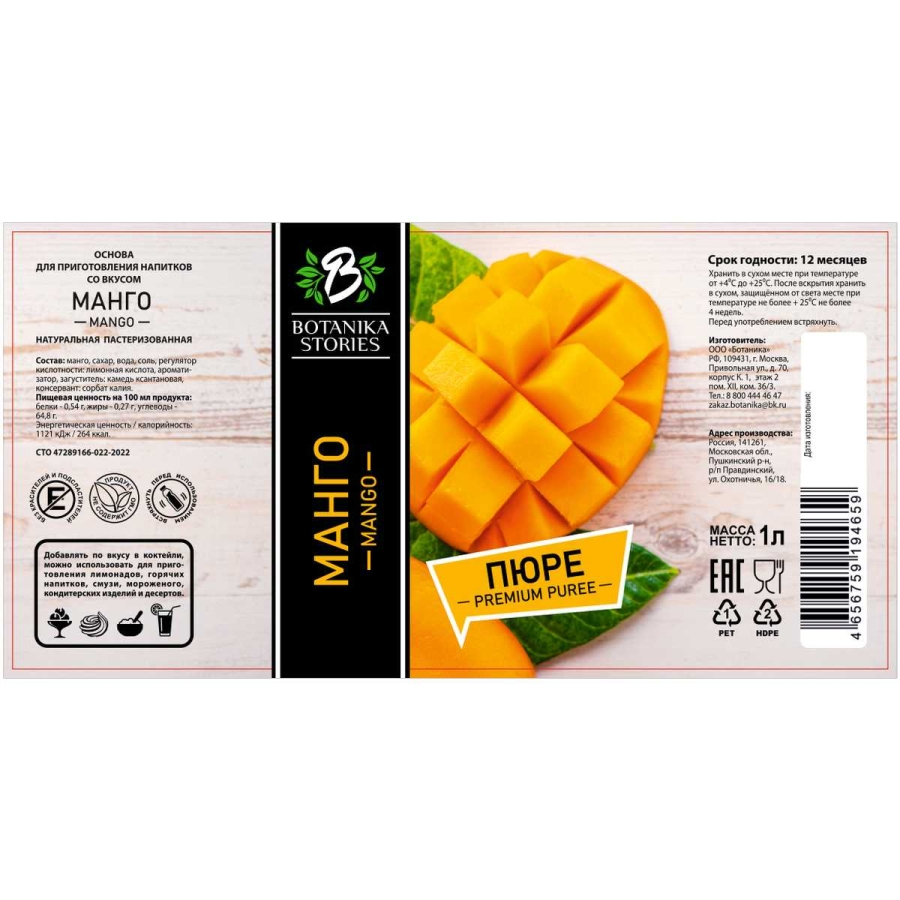 Состав: манго, сахар, вода, соль, регулятор кислотности: лимонная кислота, ароматизатор, загуститель: камедь ксантановая, консервант: сорбат калия. Пищевая ценность на 100 г продукта: белки - 0,54 г, жиры - 0,27 г, углеводы - 64,8 г Энергетическая ценность на 100 г продукта: 264 ккал